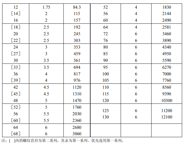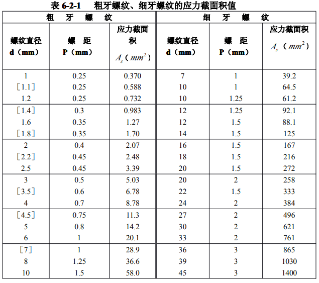 粗牙螺紋 M1~M68(GB1 93)、細牙螺紋 M8×1~M1 30×6(GB1 93)的應力截面積( As)值 ,如表 6-2-1 所示。
